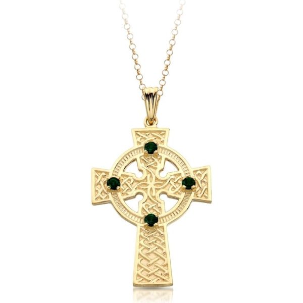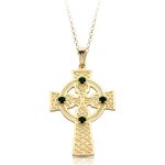 This Celtic cross is made of 9ct Gold and sturdy in design which makes it ideal piece of Irish Jewellery suitable for either man or a woman. The Celtic Cross Pendant has been engraved with traditional Celtic knot work and set with Synthtic Emerald represents the rolling hills of the Emerald Isle journey back to that beautiful land with this classic Celtic Cross pendant that will never go out of style.