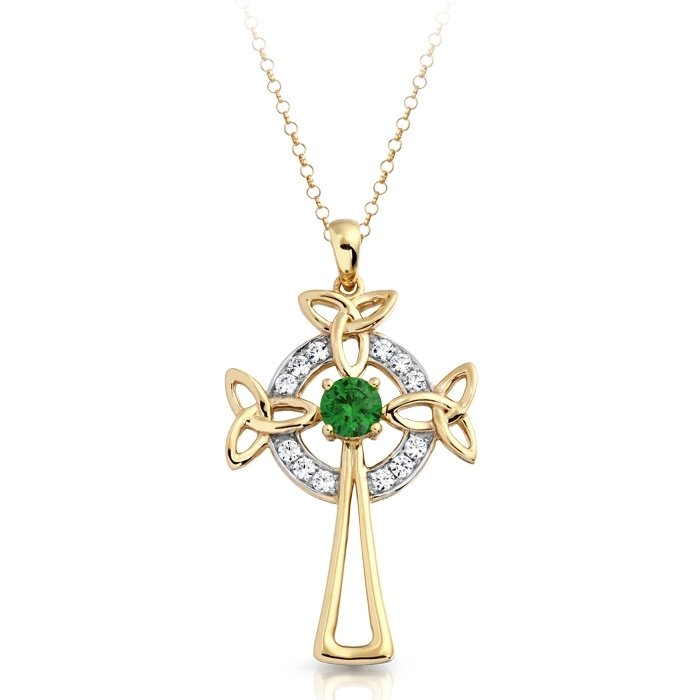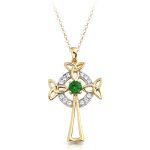 This simple design Celtic Cross made by Irish Jeweller has a distinctly Irish twist that will add to the beauty of this classic Cubic Zirconia & Synthetic Emerald Celtic Cross Pendant with Celtic Trinity Knots.