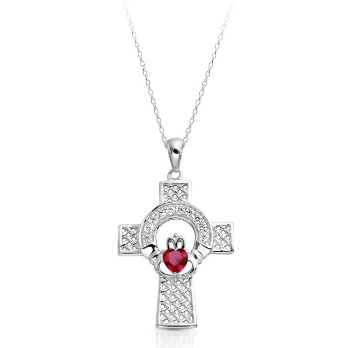 Claddagh Cross in well known traditional Irish claddagh design! The spiritual significance of this Claddagh cross design stands front and center with the striking 9K Gold filled with Intricate Micro Pave CZ setting and heart shape synthetic Ruby.
