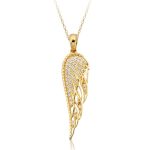 This striking Angel Wing Pendant is adorned with glittering cubic zirconia stones which makes it ideal piece of Irish Jewelry. This Celtic Pendant featuring LEFT SIDE Angel Wings with shimmering shades of detailing as light penetrates the inner facets of this truly spectacular Gold Pendant.