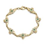 Our popular Claddagh Bracelet made of 9K Gold and has a synthetic emerald stone set in the heart and decorated with Cubic Zirconia to add extra detail and beauty. The meaning, significance and history of the claddagh have a rich ancient past that dates back to over 500 years. The claddagh is a heart encircled by pair of delicate hands with a crown above the heart. The hands of the claddagh symbolize friendship, the heart love, and the crown loyalty. The claddagh has a rich heritage and will surely be appreciated for years to come.