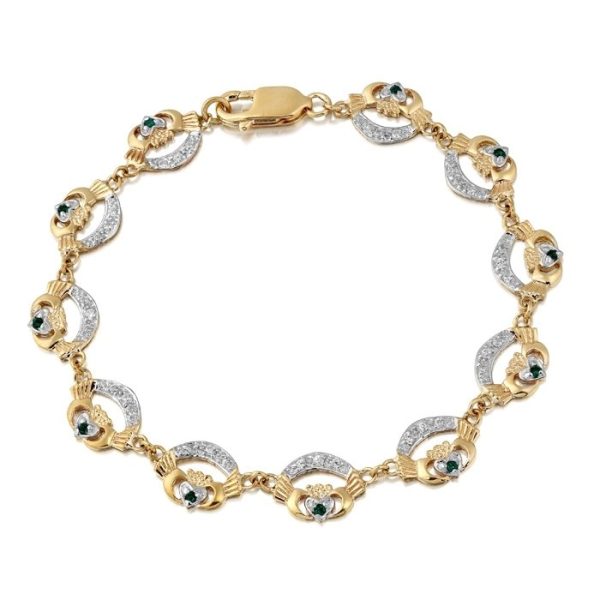 Our popular Claddagh Bracelet made of 9K Gold and has a CZ Emerald stone set in the heart and decorated with Cubic Zirconia above the Crown in arch shape to add extra detail and beauty. The meaning, significance and history of the claddagh have a rich ancient past that dates back to over 500 years. The claddagh is a heart encircled by pair of delicate hands with a crown above the heart. The hands of the claddagh symbolize friendship, the heart love, and the crown loyalty. The claddagh has a rich heritage and will surely be appreciated for years to come.