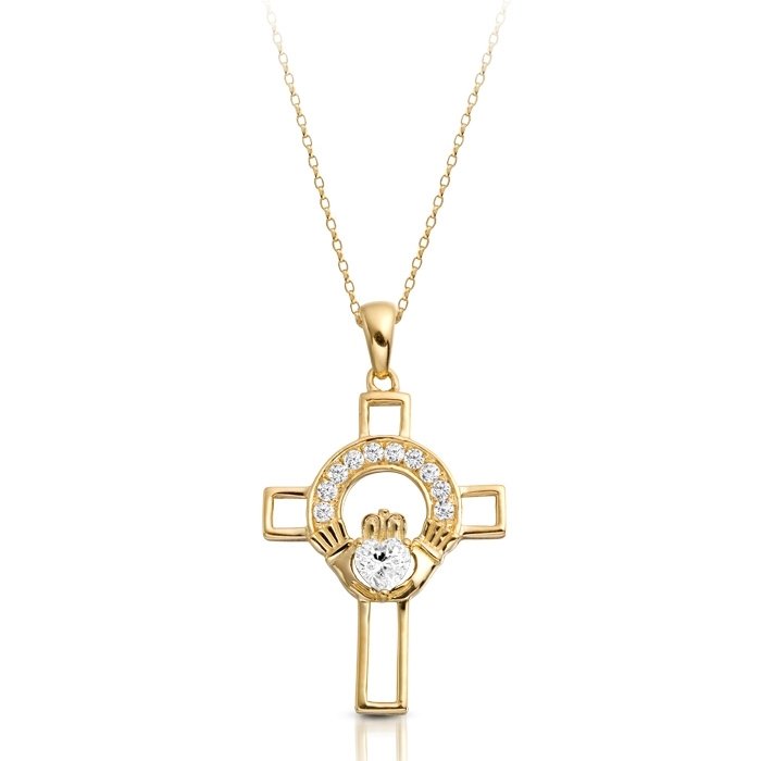 Divine symbol of faith this perfectly crafted in ireland by Claddagh Jeweler.  Irish Claddagh Cross features two hands clasping a heart surmounded by a crown. The elements of the Claddagh symbol are often said to correspond to qualities of love (the heart), friendship (the hands) and loyalty (the crown). Add your own chapter to this unique story with our beautiful Claddagh pendants.