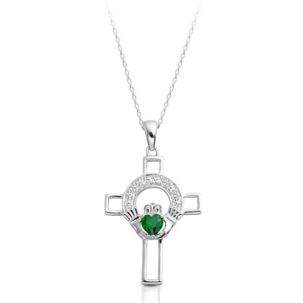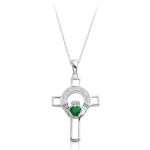 What a beautiful presentation of a Claddagh Cross in well known traditional Irish claddagh design! The spiritual significance of this Claddagh cross design stands front and center with the striking 9K White Gold filled with Micro Pave stone setting and heart shape Cubic Zirconia Emerald.