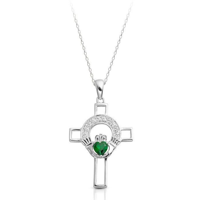 What a beautiful presentation of a Claddagh Cross in well known traditional Irish claddagh design! The spiritual significance of this Claddagh cross design stands front and center with the striking 9K White Gold filled with Micro Pave stone setting and heart shape Cubic Zirconia Emerald.