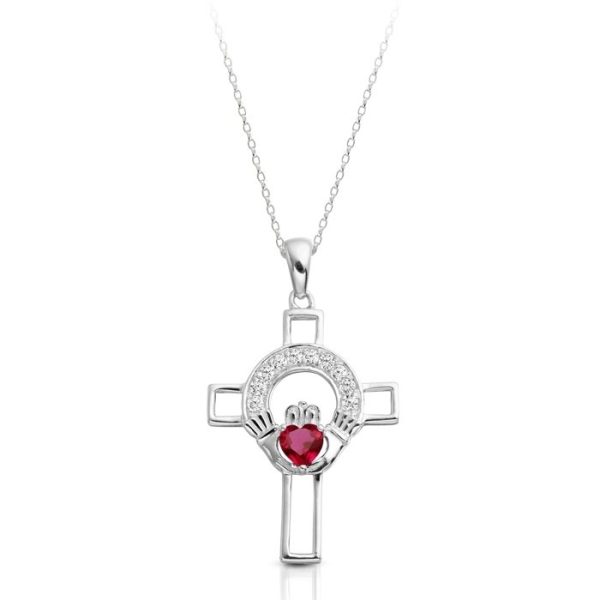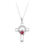 This White Gold Ruby Claddagh Cross features two hands clasping a heart surmounded by a crown. The elements of the Claddagh symbol are often said to correspond to qualities of love (the heart), friendship (the hands) and loyalty (the crown). Add your own chapter to this unique story with our beautiful Claddagh pendant.
