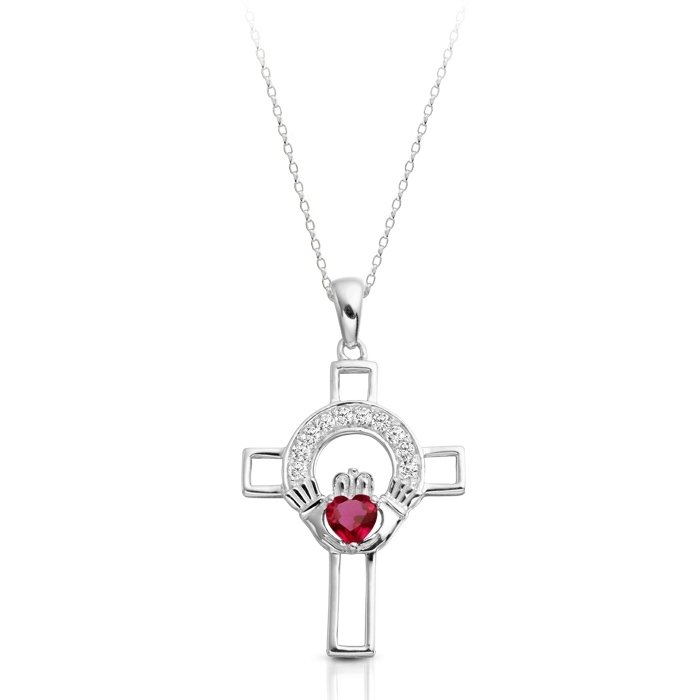 This White Gold Ruby Claddagh Cross features two hands clasping a heart surmounded by a crown. The elements of the Claddagh symbol are often said to correspond to qualities of love (the heart), friendship (the hands) and loyalty (the crown). Add your own chapter to this unique story with our beautiful Claddagh pendant.