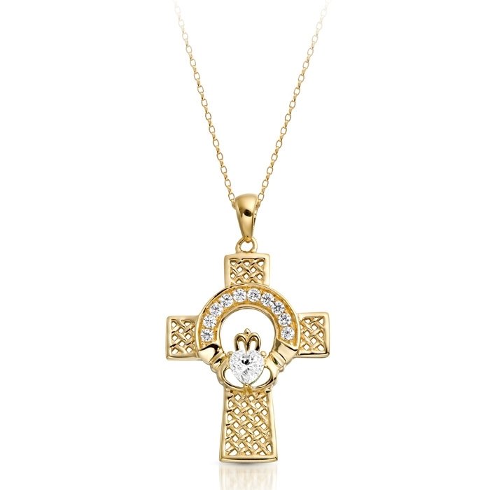 A gift of love, crafted in Ireland, it echoes a tale of devotion retold over the centuries. This beautiful Claddagh Cross pendant has been crafted from 9K Gold in Ireland with an exquisite Micro Pave stone setting and combined with Celtic Knot design to further enhance the beauty of this Claddagh Cross.