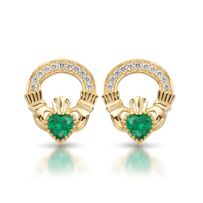 These 9ct Gold Claddagh Earrings are also available in Pendant to match. Sturdy Claddagh Earring enriched with pave setting Cubic Zirconia and synthetic Emerald set in place of the heart. Let the whispers of yesteryear echo lightly in your ears as you wear our solid & sturdy Claddagh Earring. Also these Earrings enriched with pave setting Cubic Zirconia and Heart Shape CZ set in the Heart. These chic and sparkly Earrings make a lovely Irish gift for any Irish woman, so purchase your pair today! Moreover, these Earrings made in Ireland and Dublin Assay Office Hallmarked.  Our Irish Jewellery inspired from early Claddagh and Celtic designs and full of Irish Heritage. Wear these beautiful Irish Earrings and be part of a never ending love story.