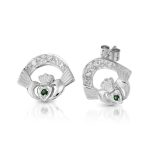 Also available in Pendant to match. Let the whispers of yesteryear echo lightly in your ears as you wear our solid & sturdy Claddagh earring enriched with pave setting Cubic Zirconia and synthetic Emerald set in place of the heart.  These chic and sparkly earrings make a lovely Irish  gift for any Irish woman, so purchase your pair today!