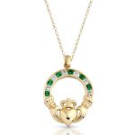This Claddagh Pendant made in Ireland by Claddagh Jeweller is set with a repeating pattern of synthetic Emerald and Cubic Zirconia, and was crafted by Irish Jeweller.