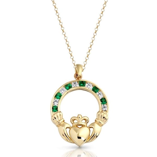 Be swept away by the beauty of this 9ct Gold Claddagh Pendant of Irish jewelry. The 9K Gold Claddagh Pendant decorated with repeated pattern of synthetic Emerald and Cubic Zirconia with precision set stone setting features the claddagh, an Irish symbol dating back over 500 years. In this Claddagh Pendant, the hands of the claddagh symbolize friendship, the heart love, and the crown loyalty, giving claddagh lovers these bonds forever.