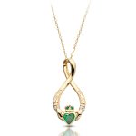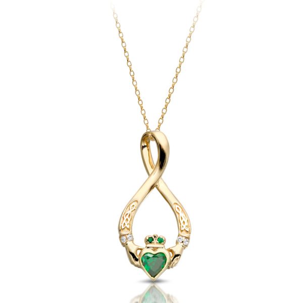 This sleek and sophisticated Pendant is the perfect choice for anyone Irish with a great sense of style. This Pendant features a stunning Heart shape gemstone in the centre and distinctive design featuring two hands holding a heart and crown. This Pendant further enhanced by a Celtic Knot for added embellishment. Celebrate your Irish Heritage with this classic design that will always remind you of your most treasured moment.  Elegant and sophisticated, this gorgeous 9ct gold pendant will lend every look a distinctly feminine edge.