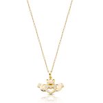 This Claddagh Pendant is crafted from 9k Gold in Ireland . This Handmade Cubic Zirconia Pendant is complete with most complex Micro Pave stone setting individually set to achieve highest level of finish and help stones shine truly. These stones Cut, Polished and set in exactly the same way as diamonds, no one will know the difference, unless you tell them.  The traditional Claddagh design streamlined and simplified but meaning and sentiment remain the same. Irish Claddagh probably the most culturally rich pieces of Irish Jewelry ever recorded in history, with the design of the claddagh Ring deeply rooted in Irish tradition. So give this Pendant to someone Irish in your life and declare your friendship, loyalty and love. This Claddagh Pendant measures 15H x 16W mm in diameter from baile to the bottom of the heart. Moreover, create a lifetime of lasting memories with this elegant Pendant.