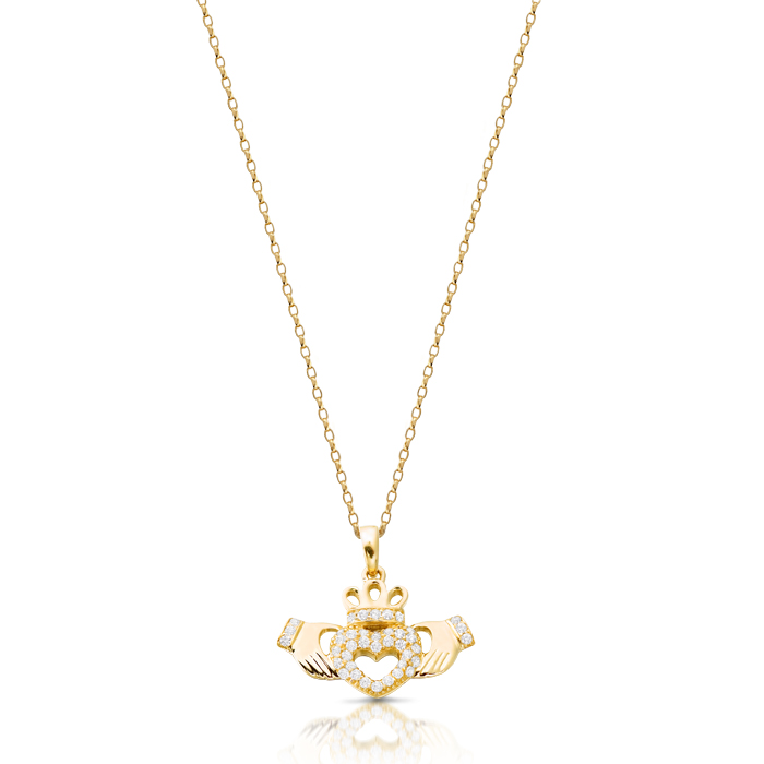 This Claddagh Pendant is crafted from 9k Gold in Ireland . This Handmade Cubic Zirconia Pendant is complete with most complex Micro Pave stone setting individually set to achieve highest level of finish and help stones shine truly. These stones Cut, Polished and set in exactly the same way as diamonds, no one will know the difference, unless you tell them.  The traditional Claddagh design streamlined and simplified but meaning and sentiment remain the same. Irish Claddagh probably the most culturally rich pieces of Irish Jewelry ever recorded in history, with the design of the claddagh Ring deeply rooted in Irish tradition. So give this Pendant to someone Irish in your life and declare your friendship, loyalty and love. This Claddagh Pendant measures 15H x 16W mm in diameter from baile to the bottom of the heart. Moreover, create a lifetime of lasting memories with this elegant Pendant.