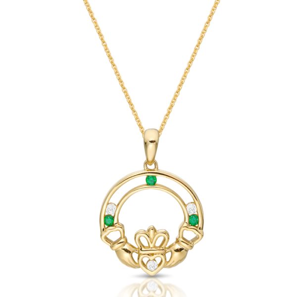 Gold Claddagh Pendant studded with Chanel set CZ Stone setting. Be swept away by the beauty of this 9ct Gold Pendant of Irish Jewelry. This Pendant decorated with Cubic Zirconia Emeralds and Cubic Zirconia with precision set stone setting. Moreover this design features the Claddagh, an Irish symbol dating back over 500 years. In this Pendant, Hands of the Claddagh symbolize friendship, Heart love, and Crown loyalty giving Claddagh lovers these bonds forever. Irish Jeweller crafted this Pendant in Ireland. Design that shows Irish heritage and makes a perfect part part of  Irish Jewelry collection. Hallmarked in Dublin Assay Office as a mark of authenticity. This Pendant set with a repeating pattern of synthetic Emerald and clear Cubic Zirconia and Heart stone set with CZ.