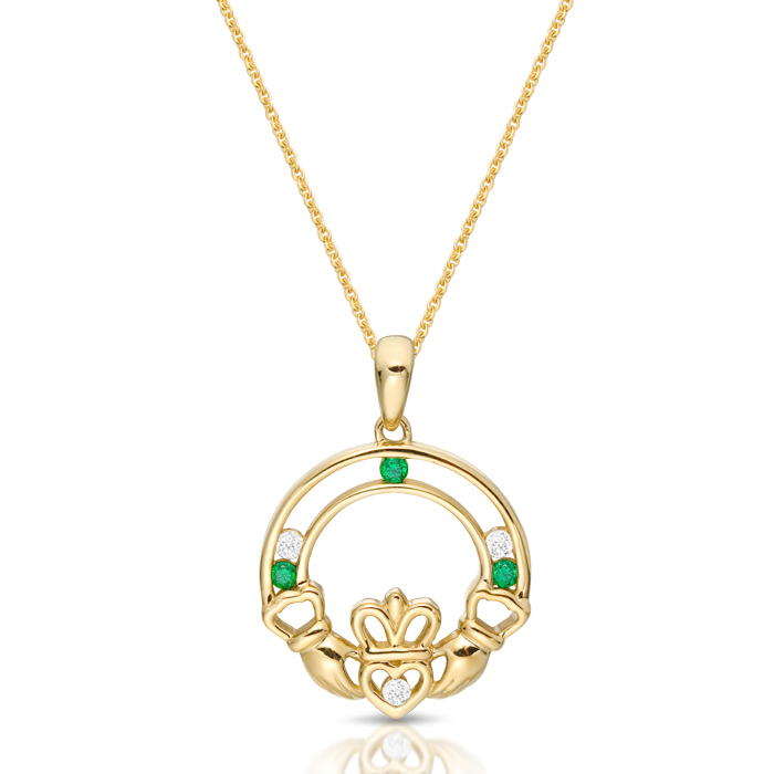 Gold Claddagh Pendant studded with Chanel set CZ Stone setting. Be swept away by the beauty of this 9ct Gold Pendant of Irish Jewelry. This Pendant decorated with Cubic Zirconia Emeralds and Cubic Zirconia with precision set stone setting. Moreover this design features the Claddagh, an Irish symbol dating back over 500 years. In this Pendant, Hands of the Claddagh symbolize friendship, Heart love, and Crown loyalty giving Claddagh lovers these bonds forever. Irish Jeweller crafted this Pendant in Ireland. Design that shows Irish heritage and makes a perfect part part of  Irish Jewelry collection. Hallmarked in Dublin Assay Office as a mark of authenticity. This Pendant set with a repeating pattern of synthetic Emerald and clear Cubic Zirconia and Heart stone set with CZ.