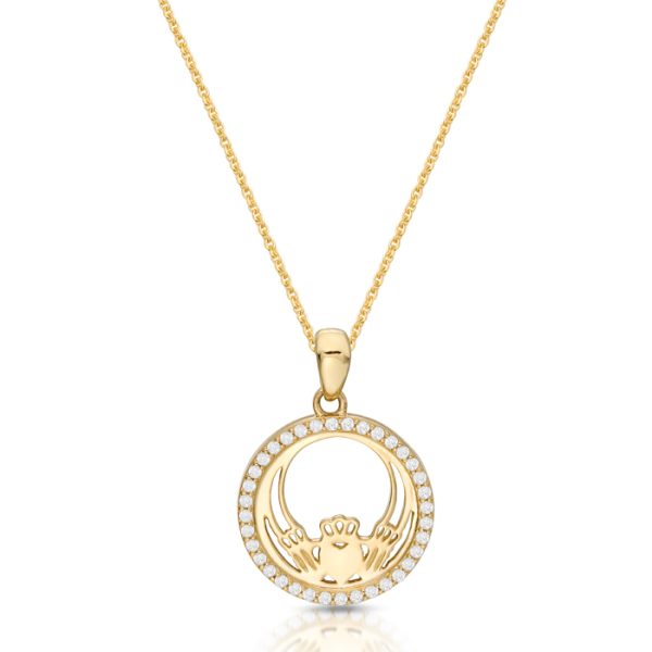 9ct Gold CZ Claddagh Pendant in Circle Shape represent your Irish heritage with this beautiful depiction of one of Ireland’s best known symbols. This Circle Shape Irish Pendant is an elegant piece that should be a staple in every woman’s Jewelry collection. Also beauty of owning a piece of Irish Jewelry not only lies in its elegance, but also in its sentiment. The classic Raindance Irish Pendant has a timeless appeal. At Irish Jeweller, we know Jewellery hold a very special meaning. We take pride in our delicate craftsmanship, paying close attention to detail for your special and one-of-a-kind ring. Celebrating stories of love, success and more.
