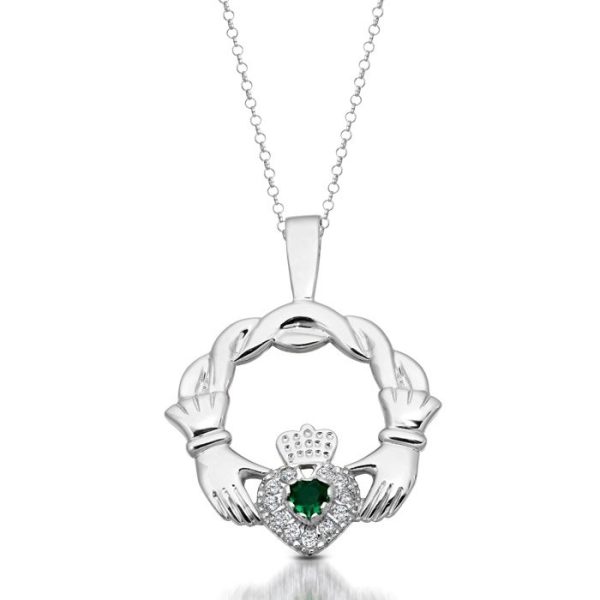 This Claddagh Pendant has a synthetic Emerald set in place of the Hear and surrounded by Pave set CZ. Feel your Irish roots as you wear this sturdy unisex 9K Gold Claddagh Pendant.