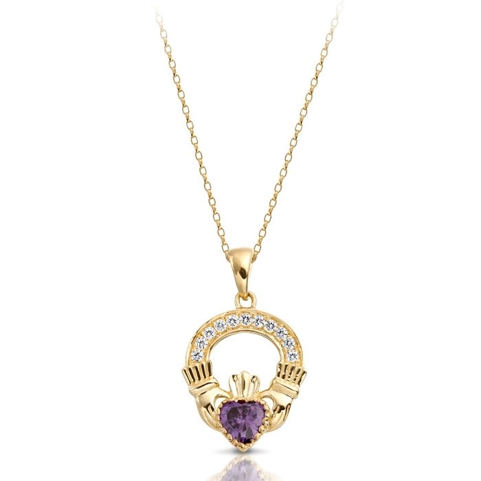 This 9ct Gold Cubic Zirconia Claddagh Pendant also available in Earrings to match.  Feel your Irish roots as you wear this sturdy Claddagh Pendant made in Ireland by Irish Jeweller enriched with Micro Pave setting Cubic Zirconia and synthetic Amethyst set in place of the heart.