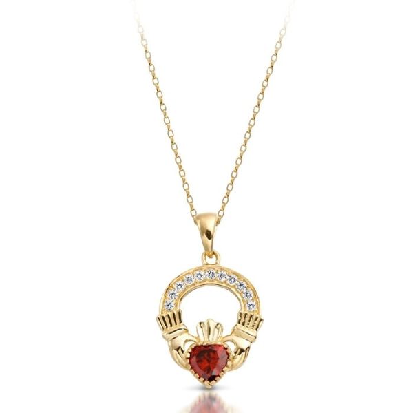 This 9ct Gold Cubic Zirconia Claddagh Pendant also available in Earrings to match.  Feel your Irish roots as you wear this sturdy Claddagh Pendant made in Ireland by Irish Jeweller enriched with Micro Pave setting Cubic Zirconia and synthetic Garnet set in place of the heart.