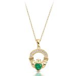 This 9ct Gold Cubic Zirconia Claddagh Pendant also available in Earrings to match.  Feel your Irish roots as you wear this sturdy Claddagh Pendant made in Ireland by Irish Jeweller enriched with Micro Pave setting Cubic Zirconia and synthetic Emerald set in place of the heart.