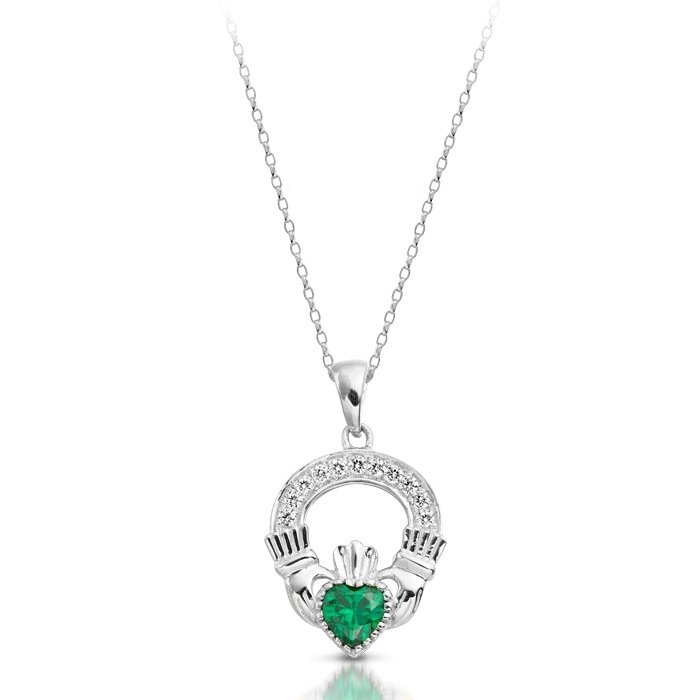 This 9ct White Gold Cubic Zirconia Claddagh Pendant also available in Earrings to match. Feel your Irish roots as you wear this sturdy Claddagh Pendant made in Ireland by Irish Jeweller enriched with Micro Pave setting Cubic Zirconia and synthetic Emerald set in place of the heart.