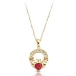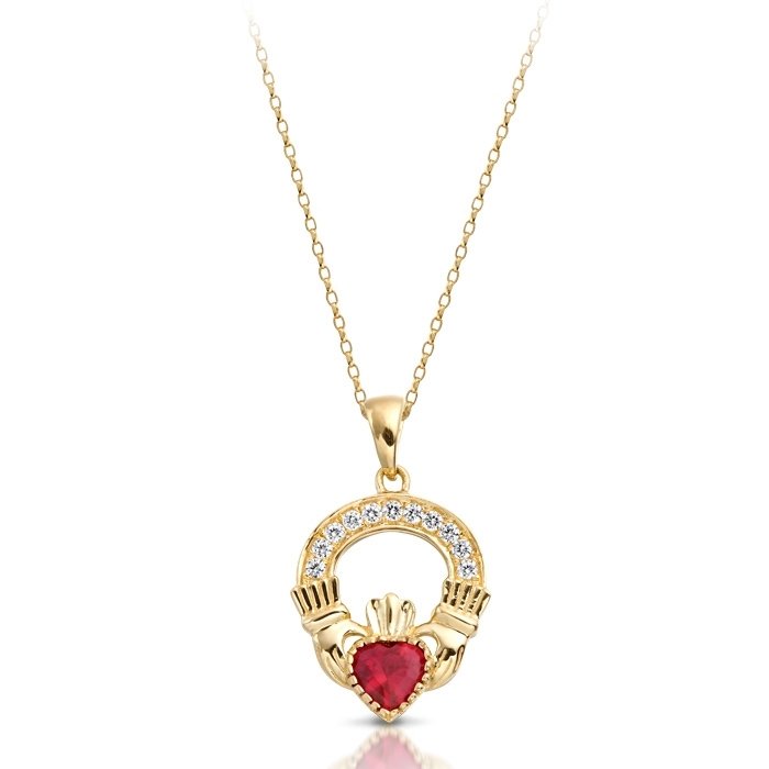 This 9ct Gold Cubic Zirconia Claddagh Pendant also available in Earrings to match.  Feel your Irish roots as you wear this sturdy Claddagh Pendant made in Ireland by Irish Jeweller enriched with Micro Pave setting Cubic Zirconia and synthetic Ruby set in place of the heart.