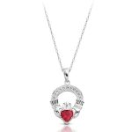 This 9ct White Gold Cubic Zirconia Claddagh Pendant also available in Earrings to match.  Feel your Irish roots as you wear this sturdy Claddagh Pendant made in Ireland by Irish Jeweller enriched with Micro Pave setting Cubic Zirconia and synthetic Ruby set in place of the heart.