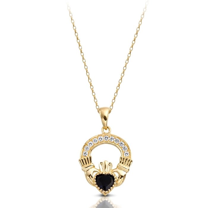 This 9ct Gold Cubic Zirconia Claddagh Pendant also available in Earrings to match.  Feel your Irish roots as you wear this sturdy Claddagh Pendant made in Ireland by Irish Jeweller enriched with Micro Pave setting Cubic Zirconia and synthetic Sapphire set in place of the heart.
