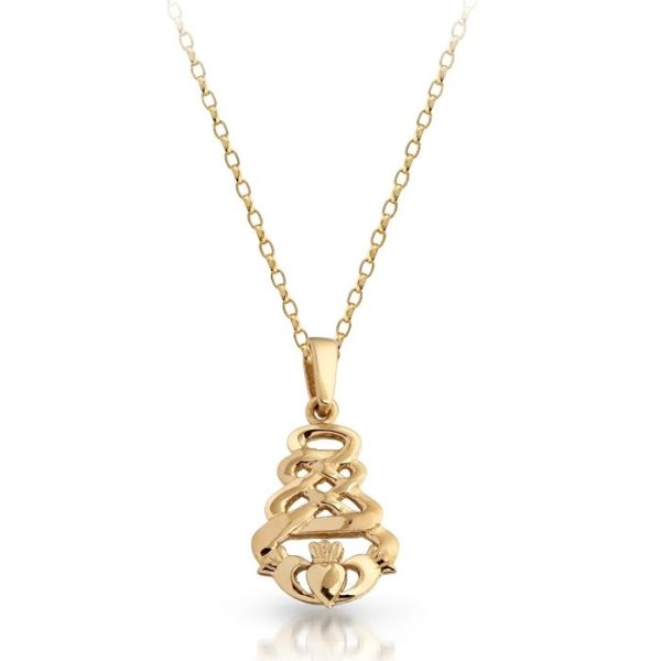 Made in Ireland by Claddagh Jeweler this 9ct Gold Claddagh Pendant with Celtic pattern reveals the sleek and modern artistry of Irish Jewelry and certainly captures the Irish history.