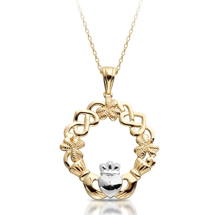 Claddagh Pendant with Shamrock and Knot Celtic Knot. This Claddagh Necklace is a wonderful combination of cultural symbols.  Also this sleek Claddagh Necklace design takes on the popular Irish trend and enhanced with modern twist for timeless style. Combined with Claddagh, Shamrock and Celtic pattern to reflect the Irish inspiration.