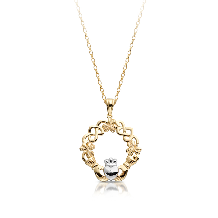 9ct Gold Claddagh Pendant with Shamrock and Knot Celtic Knot. This Claddagh Necklace is a wonderful combination of cultural symbols.  Also this sleek Claddagh Necklace design takes on the popular Irish trend and enhanced with modern twist for timeless style. Combined with Claddagh, Shamrock and Celtic pattern to reflect the Irish inspiration. Also this sophisticated Pendant Symbolising eternal life and longevity is the perfect choice for anyone Irish. This Pendant features a distinctive design featuring two hands holding a heart and crown. Treat yourself with this truly beautiful Irish Jewelry collection to complete the Irish look. Elegant and sophisticated, this gorgeous 9ct gold pendant will lend every look a distinctly feminine edge.