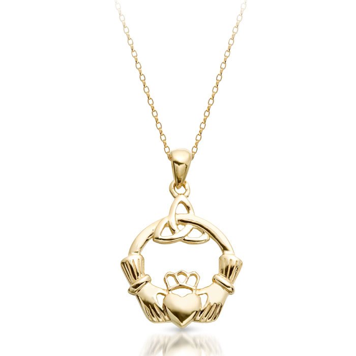 Claddagh Pendant with Trinity Knot Celtic Knot. This Claddagh and Celtic Pendant with soft curves Symbolising Love, Loyalty, Friendship. Also within the intricate curving lines of the Trinity Knot, faith in God is illustrated, as the three points symbolize the Father, the Son, and The Holy Spirit. This Claddagh Necklace designed in polished 9ct Gold and showcases a distinctive interlace Celtic pattern to reflect the Irish inspiration.
