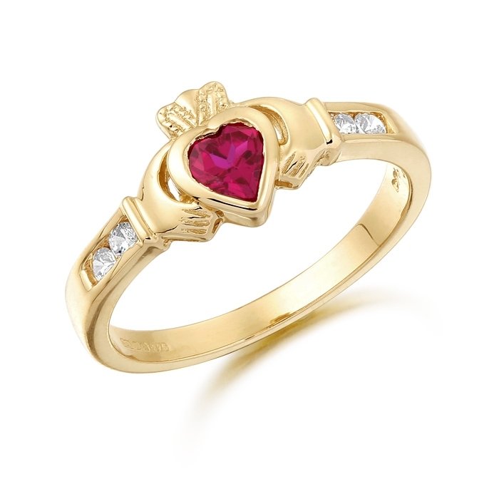 This Claddagh ring has synthetic Ruby stone set as Heart in 9K Gold with precision set cubic zirconia settings on each side of the shoulder to enhance the beauty and craftsmanship. This Claddagh Ring will be a pleasure for the recipient to wear this beautiful claddagh ring.