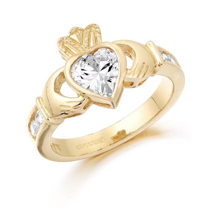 This Claddagh Ring has a Cubic Zirconia stone set as Heart in 9K Gold  with precision set cubic zirconia settings on each side of the shoulder to enhance the beauty and craftsmanship. It will be a pleasure for the recipient to wear this beautiful Claddagh Ring.