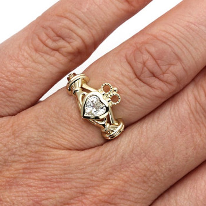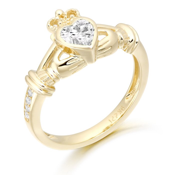 9K Gold CZ Claddagh Ring with magnificent detailing and Micro Pave stone setting.