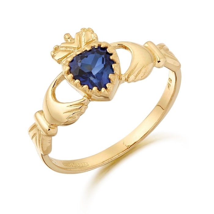 Claddagh Ring, a beautiful presentation of the well known traditional Irish Jewelry design!  This elegant Sapphire Ring crafted from 9K Gold.  Also this Ring represents Claddagh image of love, friendship and loyalty seen in the symbol of heart, hands and crown.