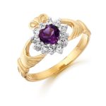 This Amethyst Claddagh Ring has a Amethyst stone set as Heart and further improved with Cubic Zirconia halo surround of Cubic Zirconia stones. This Ring further decorate the idea to bring out the beauty and sparkle in Claddagh Rings design. Whatever the occasion, this Ring makes a perfect Irish Jewelry gift. One can’t help but adore the beautiful Irish craftsmanship., this Ladies Cubic Zirconia Ring crafted from 9K Gold in Ireland.