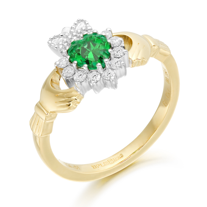 18K Gold Diamond and Emerald Claddagh Ring.  Give your fine jewellery collection a splash of colour with this stunning Emerald and Diamond Ring.