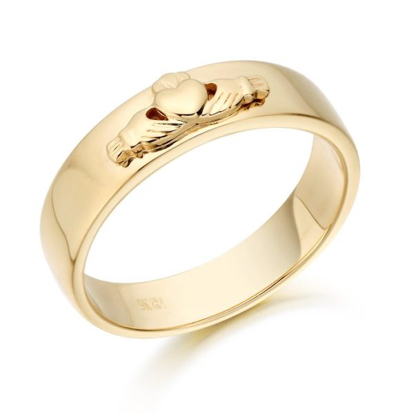Great style Claddagh Wedding Ring!  Unique Claddagh Wedding Ring for ladies and men. Signature Collection. Two tone, all yellow or all white in  9K Gold 6 mm wide.   Hand made in Ireland and matching set available to buy in his & her size to present each other on their Wedding day!