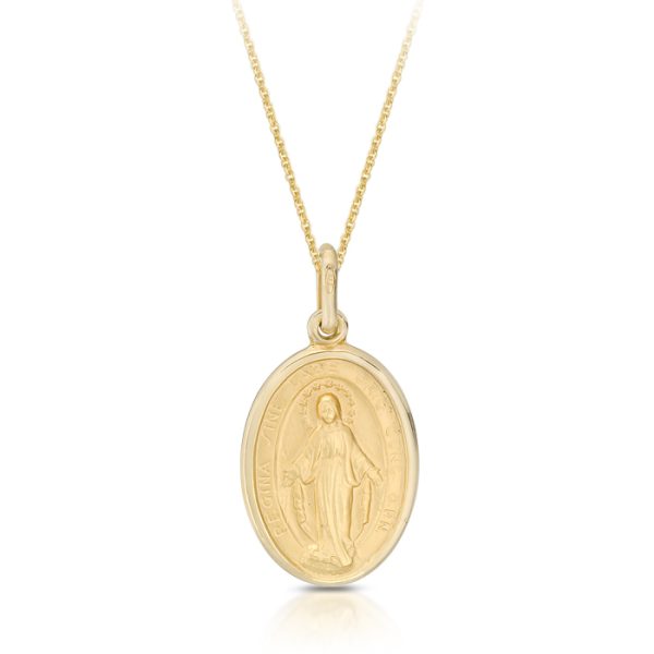 This 9ct Gold Miraculous Medal Pendant  Medal is a special medal design based on mystical visions of St. Catherine Labouré. Also, Irish Jeweller further enhanced this medal with Diamond cut edge. Moreover, this Medal Pendant made in Ireland and crafted from 9K Gold. The Medal of the Immaculate Conception, popularly known as Catholics the world over as the Miraculous Medal. The oval-shaped medallion is beautifully adding a touch of sophistication and divine charm. The front of the medal depicts Mary standing on a globe, with the head of a serpent beneath her feet.  The left heart, circled with thorns, represents Jesus. The right heart, pierced by a sword, symbolizes Mary.