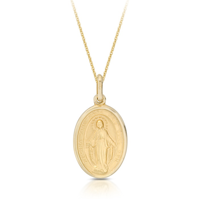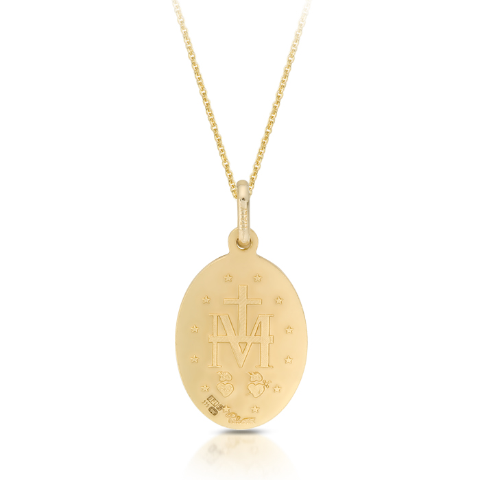 This 9ct Gold Miraculous Medal Pendant  Medal is a special medal design based on mystical visions of St. Catherine Labouré. Also, Irish Jeweller further enhanced this medal with Diamond cut edge. Moreover, this Medal Pendant made in Ireland and crafted from 9K Gold. The Medal of the Immaculate Conception, popularly known as Catholics the world over as the Miraculous Medal. The oval-shaped medallion is beautifully adding a touch of sophistication and divine charm. The front of the medal depicts Mary standing on a globe, with the head of a serpent beneath her feet.  The left heart, circled with thorns, represents Jesus. The right heart, pierced by a sword, symbolizes Mary.
