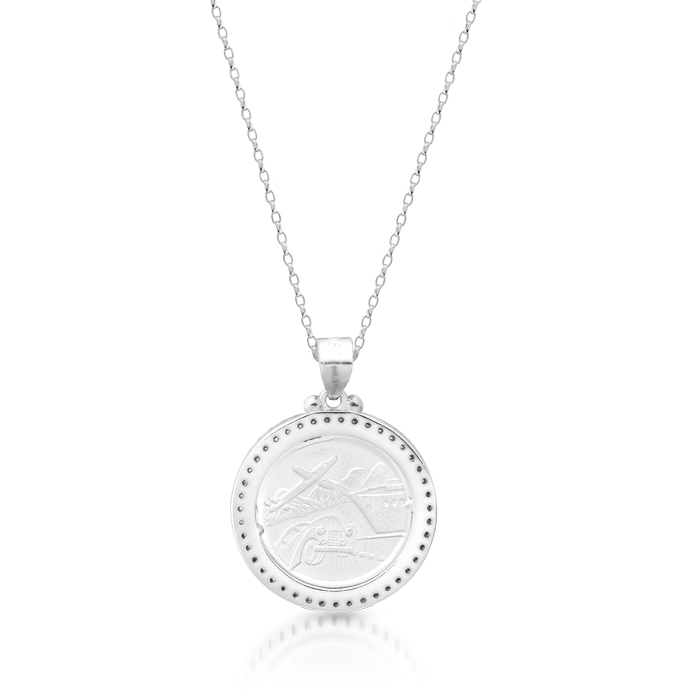 Silver Saint Christopher Medal made in Ireland studded with CZ stones. The one-time Catholic patron saint of travellers and commonly worn as a Pendant especially by travellers, to show devotion and as a request for his blessing. St. Christopher is a widely popular saint, especially revered by athletes and travellers. He holds patronage of things related to travel and travellers against Lightning and Pestilence, Boatman, Soldiers etc. Christopher is the patron saint of many places. Because St. Christopher offered protection to travellers and against sudden death, many churches placed images or statues of him, usually opposite the south door, so he could be easily seen. He is usually depicted as a giant of a man, with a child on his shoulder and a staff in one hand. The reverse side of the medal showcases a beautifully etched travel motif, including an airplane, train, ship, and car—making it the perfect gift for frequent travelers or loved ones embarking on a journey.