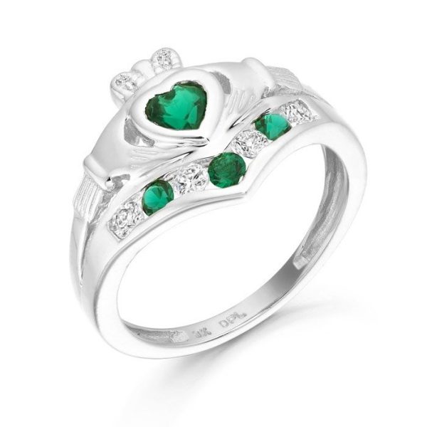 This Claddagh Ring with Cubic Zirconia is crafted from Silver in Ireland by Claddagh Jeweler and Rhodium plated for mirror shine. This lovely Claddagh Ring for her features a Heart shape CZ Emerald stonein the center of the heart and further enhanced with Round Cubic Zirconia set in a repeated pattern.