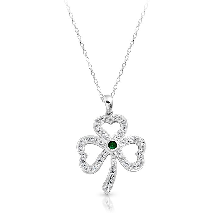 While wearing this festive, Celtic Shamrock Pendant you will always have the luck of the Irish. This Celtic Shamrock Pendant is set with Cubic Zirconia micro Pave stone setting & Synthetic Green Emerald in the centre of the pendant sure to display your Irish pride.