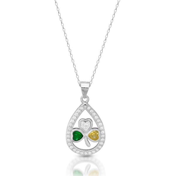 Silver Shamrock Pendant. Celebrate Irish tradition with a vibrant twist in this multi-coloured teardrop shamrock pendant. Crafted from lustrous sterling silver, the pendant features a graceful teardrop-shaped frame encrusted with clear, sparkling stones that add brilliance and elegance. Inside Silver Shamrock Pendant, a striking three-leaf clover is formed with heart-shaped stones in a unique tricolour design—emerald green, golden yellow, and crystal white—symbolizing growth, prosperity, and purity. Beauty of owning a piece of Irish Jewelry not only lies in its elegance, but also in its sentiment. This radiant pendant captures the spirit of Irish tradition with a refined, modern twist.