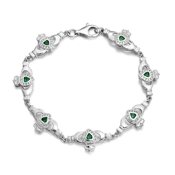 Our popular Claddagh Bracelet made of Silver and Rhodium plated for mirror finish and has a synthetic emerald stone set in the heart and decorated with Cubic Zirconia to add extra detail and beauty.