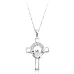 What a beautiful presentation of a Claddagh Cross in well known traditional Irish claddagh design! The spiritual significance of this Claddagh cross design stands front and center with the striking Rhodium Plated Silver filled with Micro Pave stone setting and heart shape Cubic Zirconia.