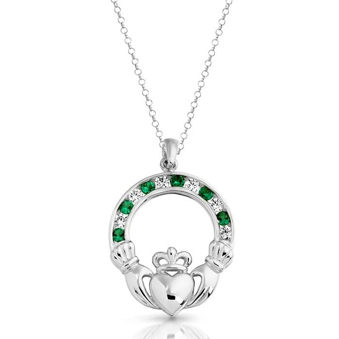 This Claddagh Pendant made in Ireland by Claddagh Jeweler is set with a repeating pattern of synthetic Emerald and Cubic Zirconia.